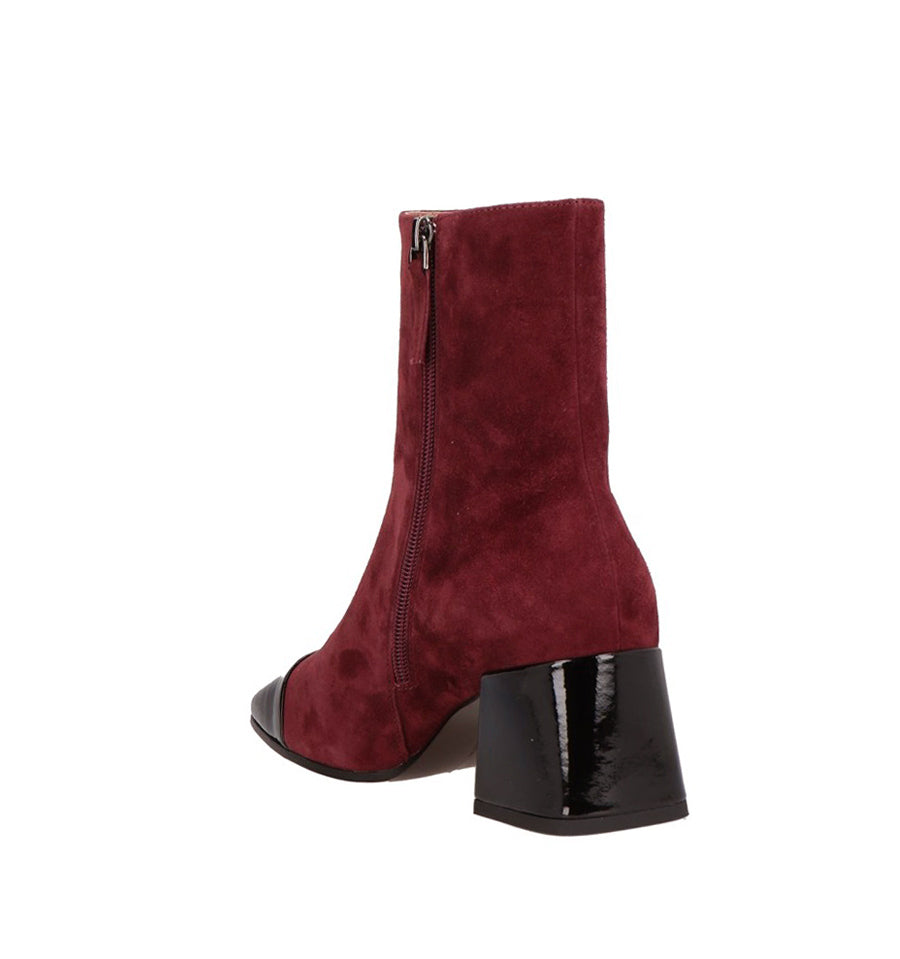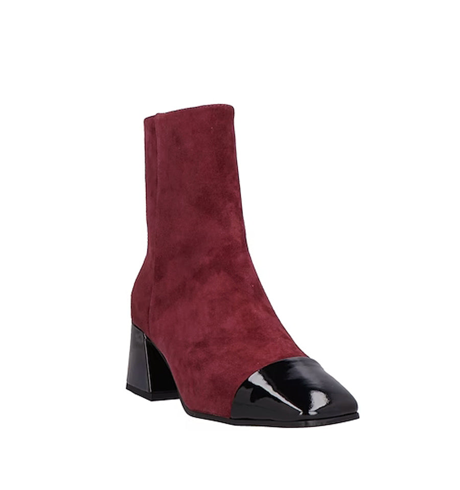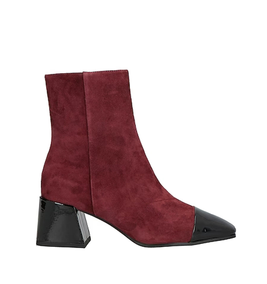 Botín tipo chanel de Bibi Lou en ante burdeos con puntera cuadrada y tacón en charol negro.