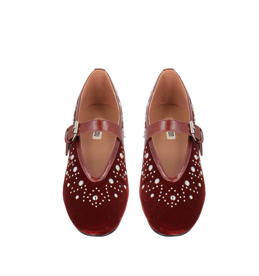 Merceditas bailarina de Bibi Lou en terciopelo color terracota con adorno de tachas.