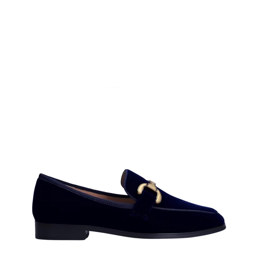 Mocasín de  Bibi Lou  en terciopelo color marino con adorno de estribo en metal dorado.
