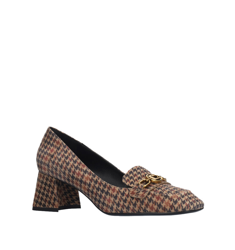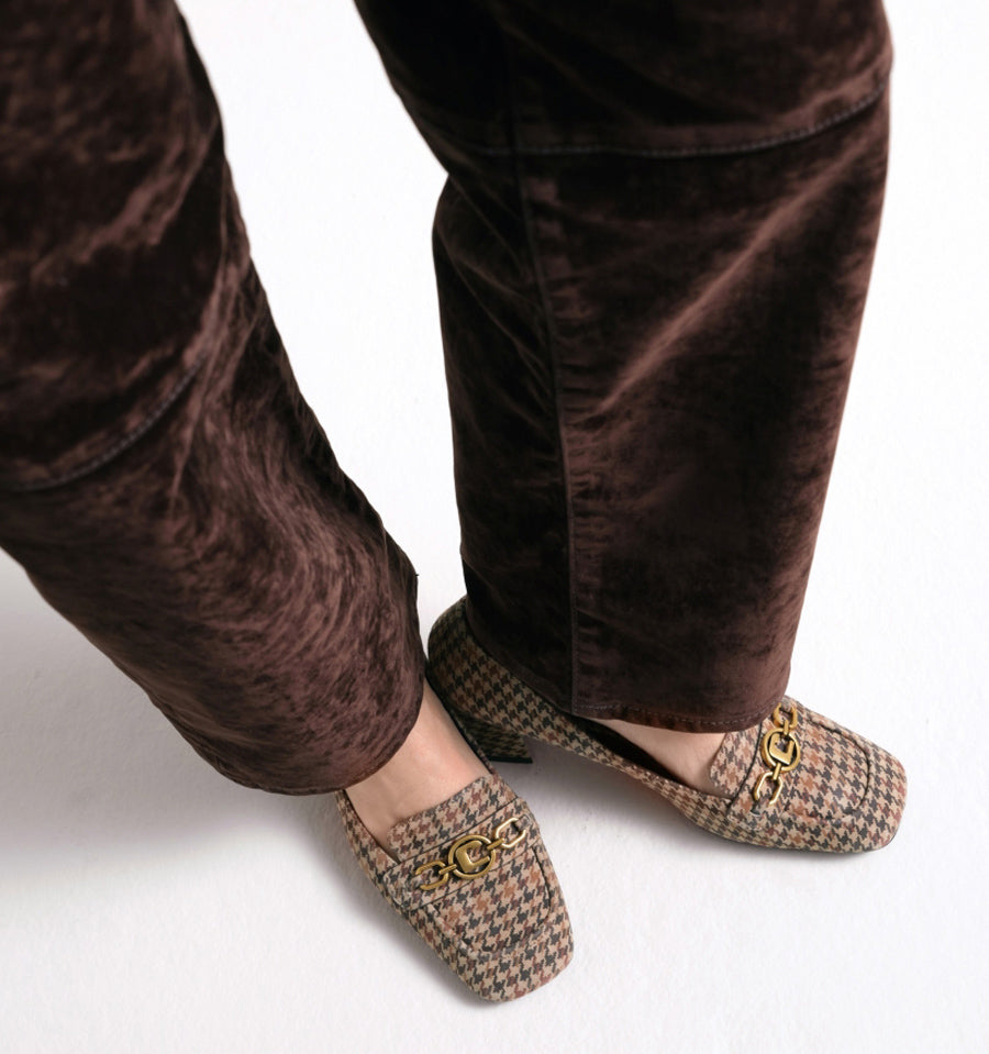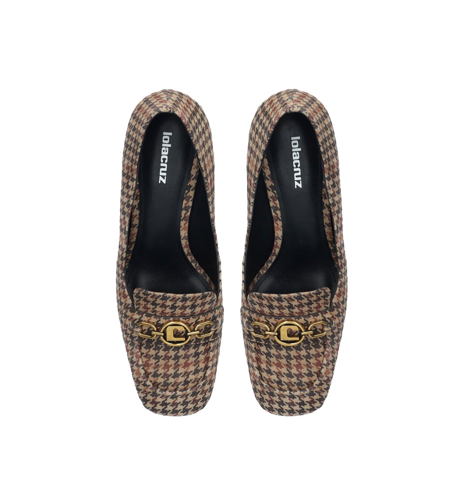 Mocasín de Lola Cruz en pata de gallo en color camel con adorno metálico.