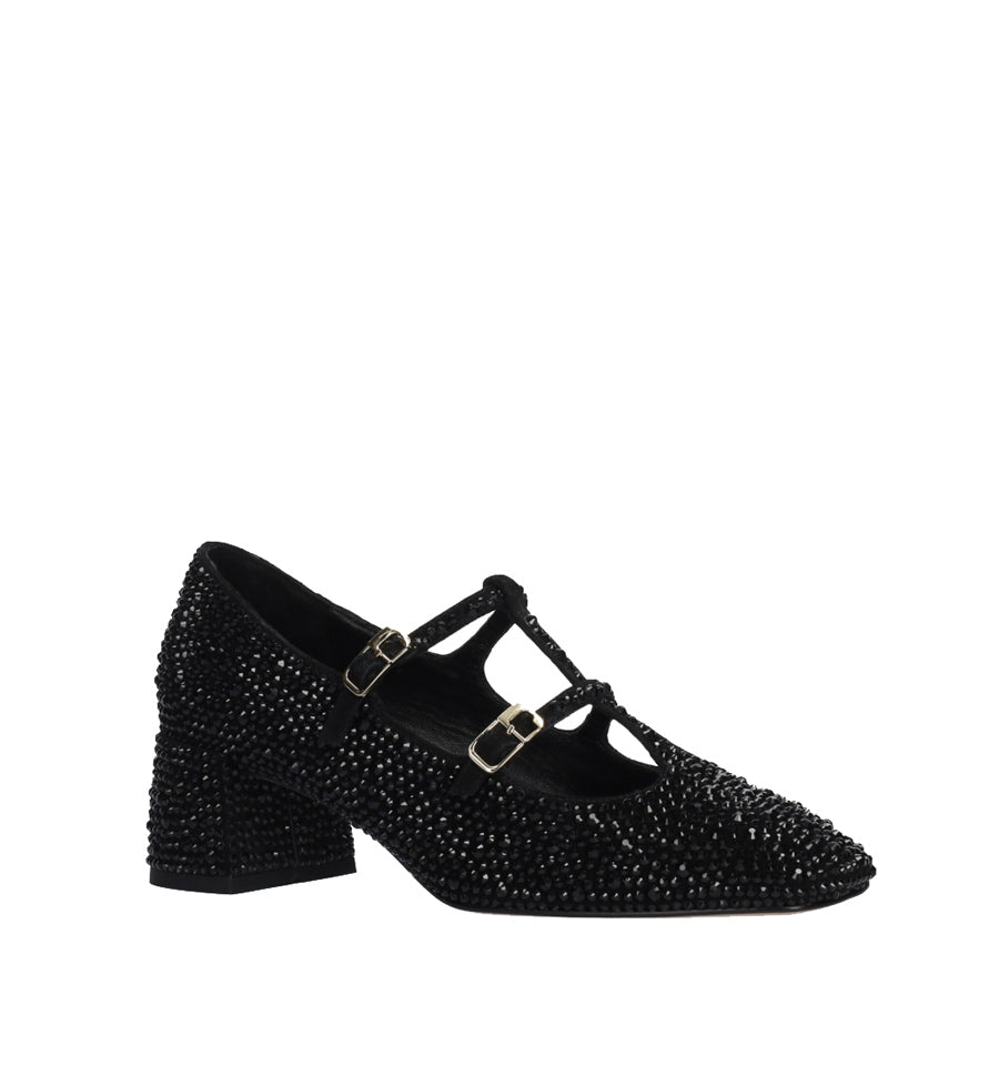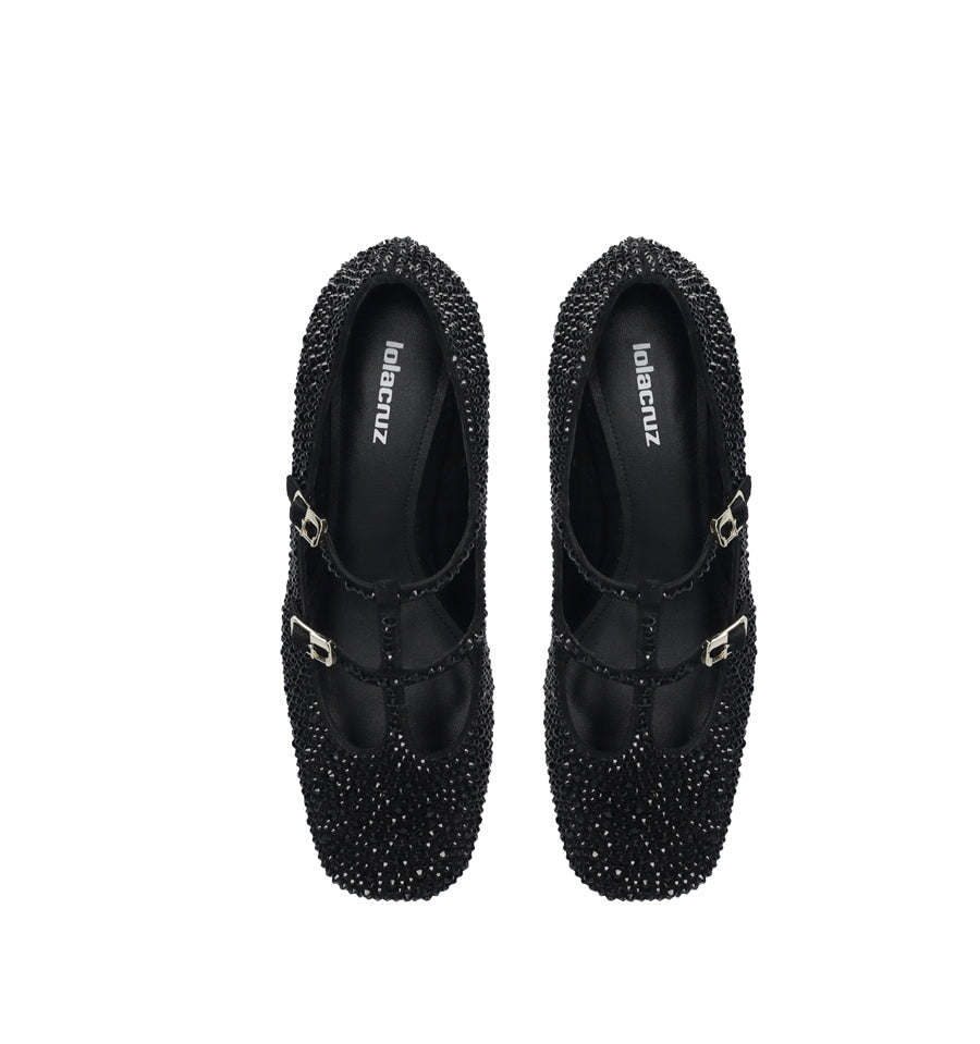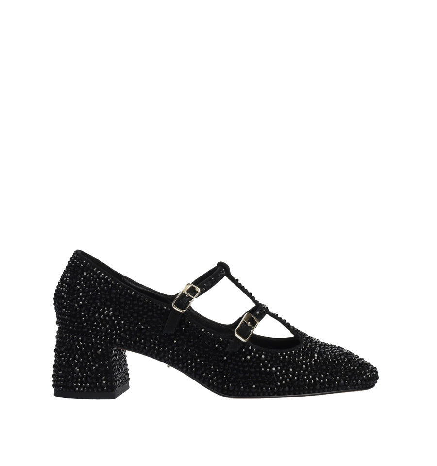 Merceditas de Lola Cruz con doble pulsera y tira "T" en cristal negro pata de gallo en color camel con adorno metálico.