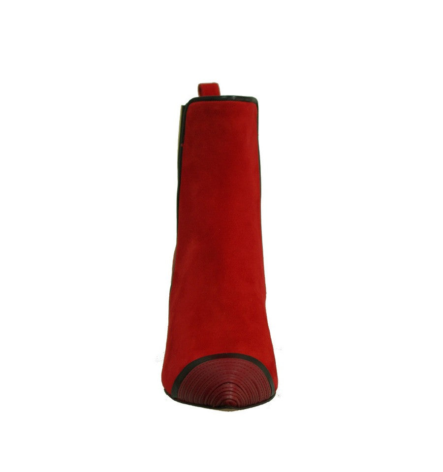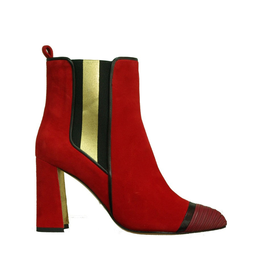 Botín de Pura López en ante color rojo con puntera en piel roja, vivos en piel negro y elásticos laterales en oro/negro.