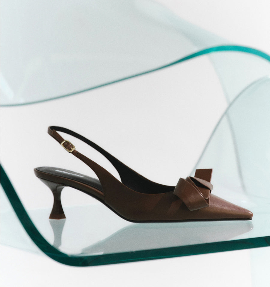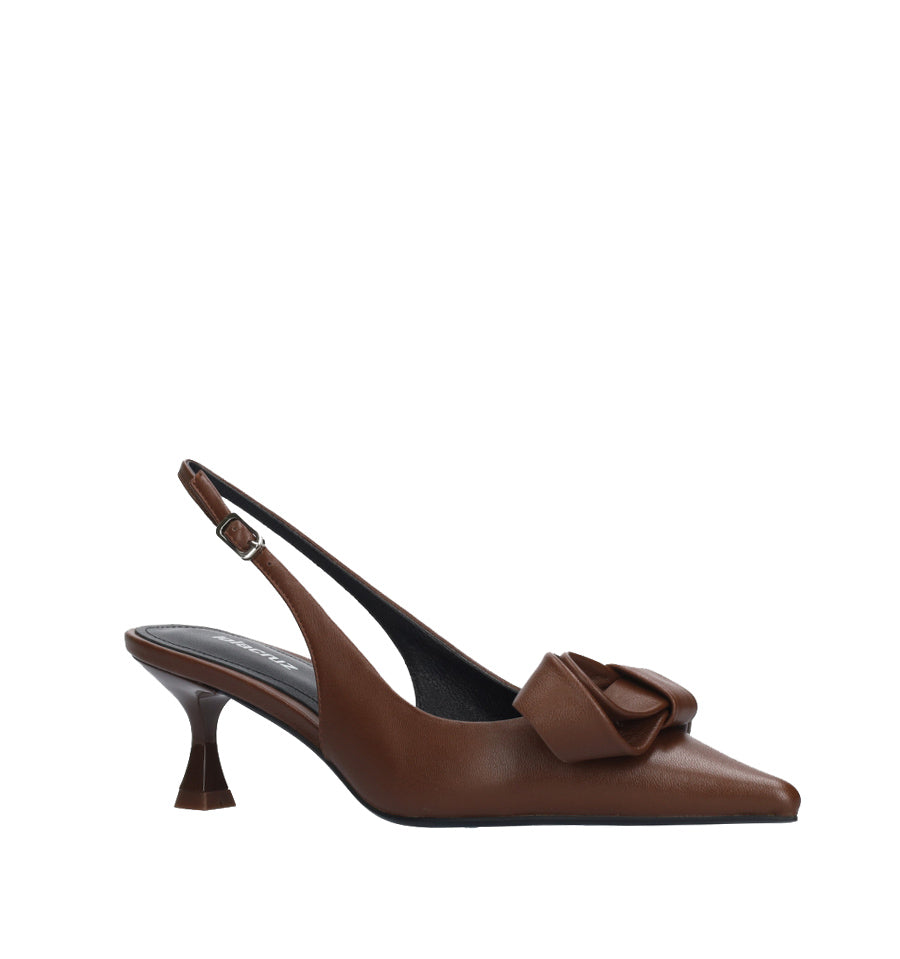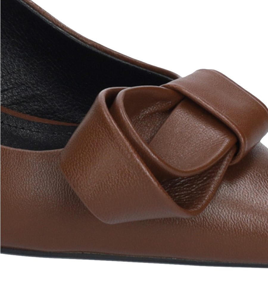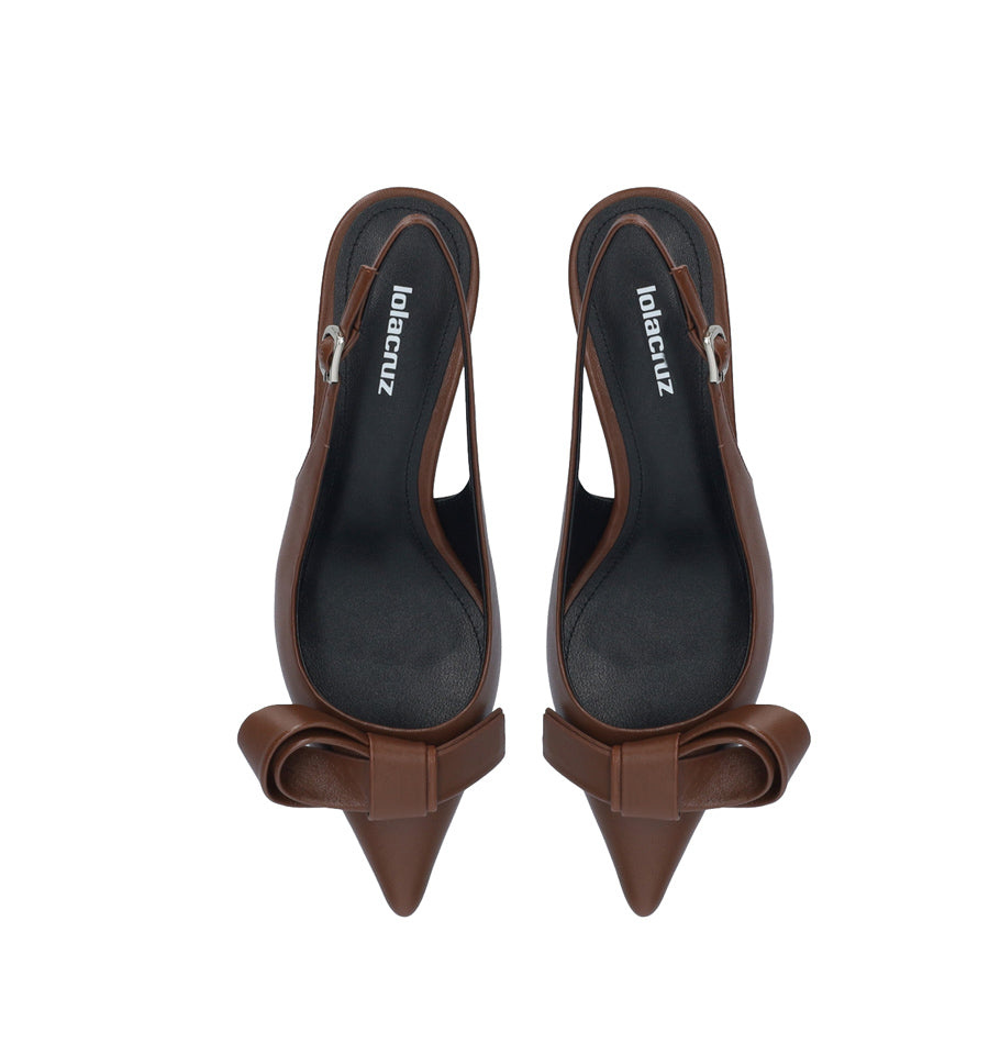 Destalonado de Lola Cruz en piel color marrón con adorno de lazo rizado.