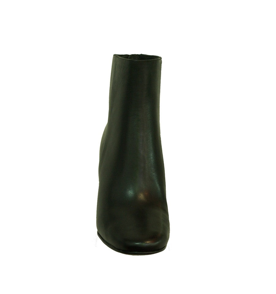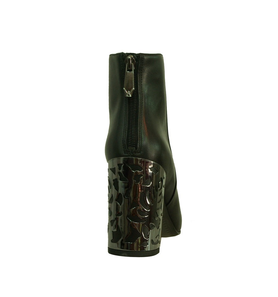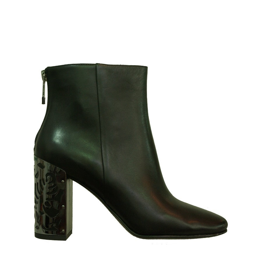 Botín de What Fort fabricado en piel color negro con adorno calado metálico en el tacón.