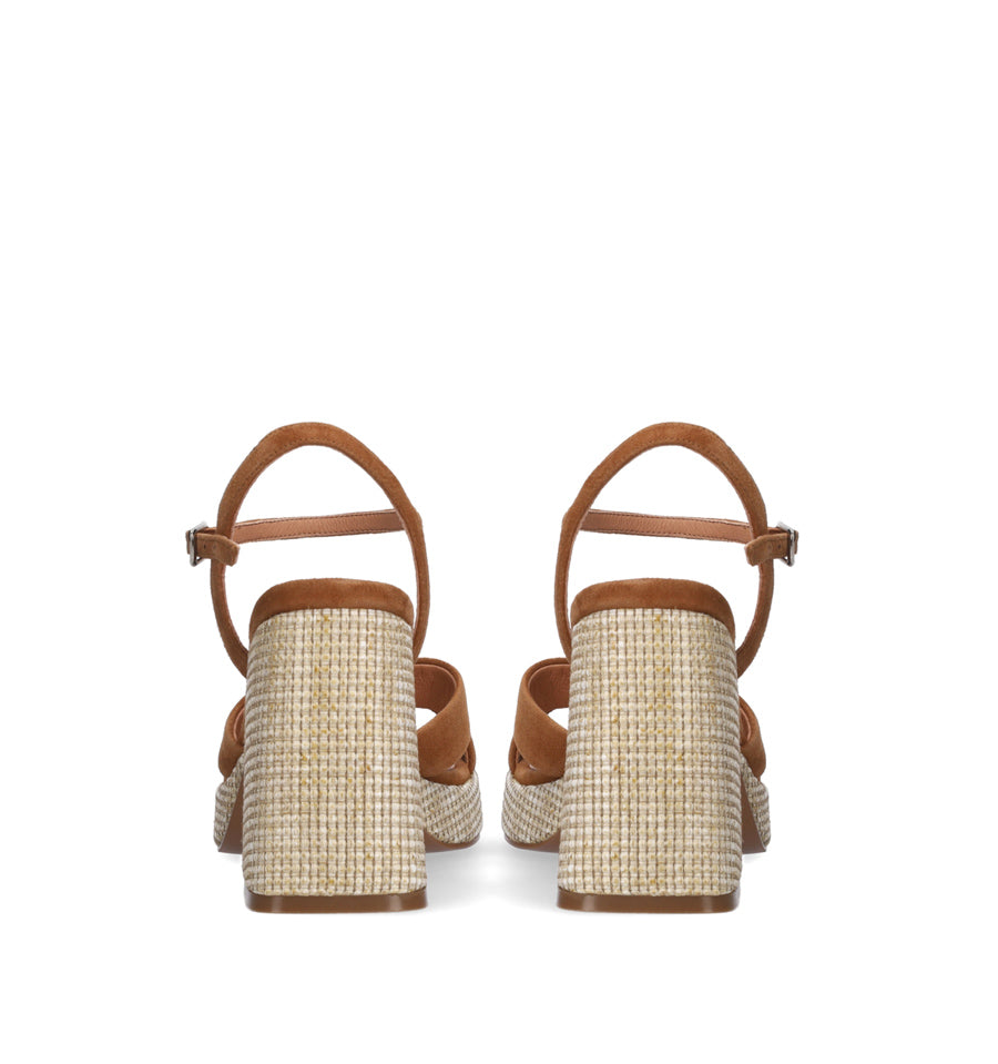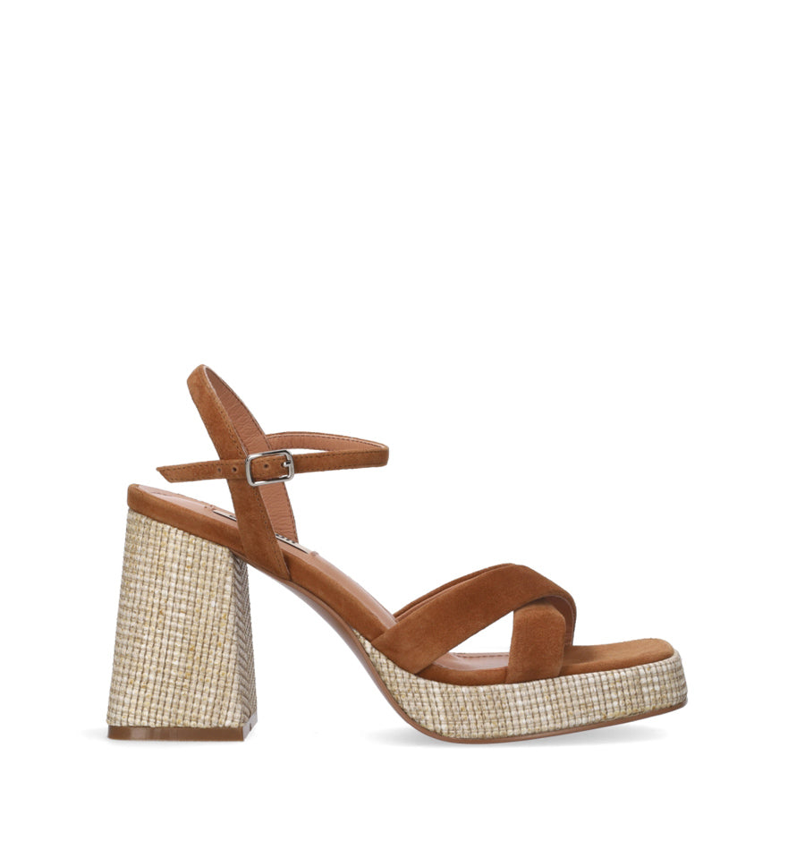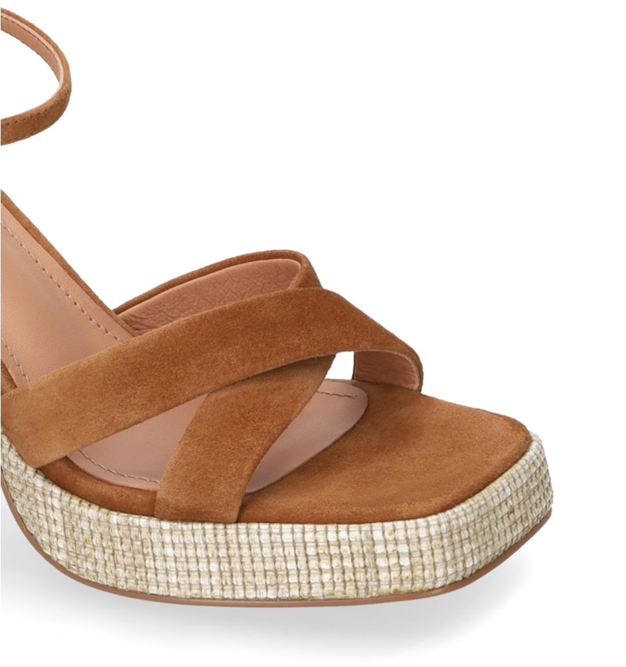 Sandalia de Bibi Lou en ante color cuero con tiras cruzadas y plataforma en rafia natural.