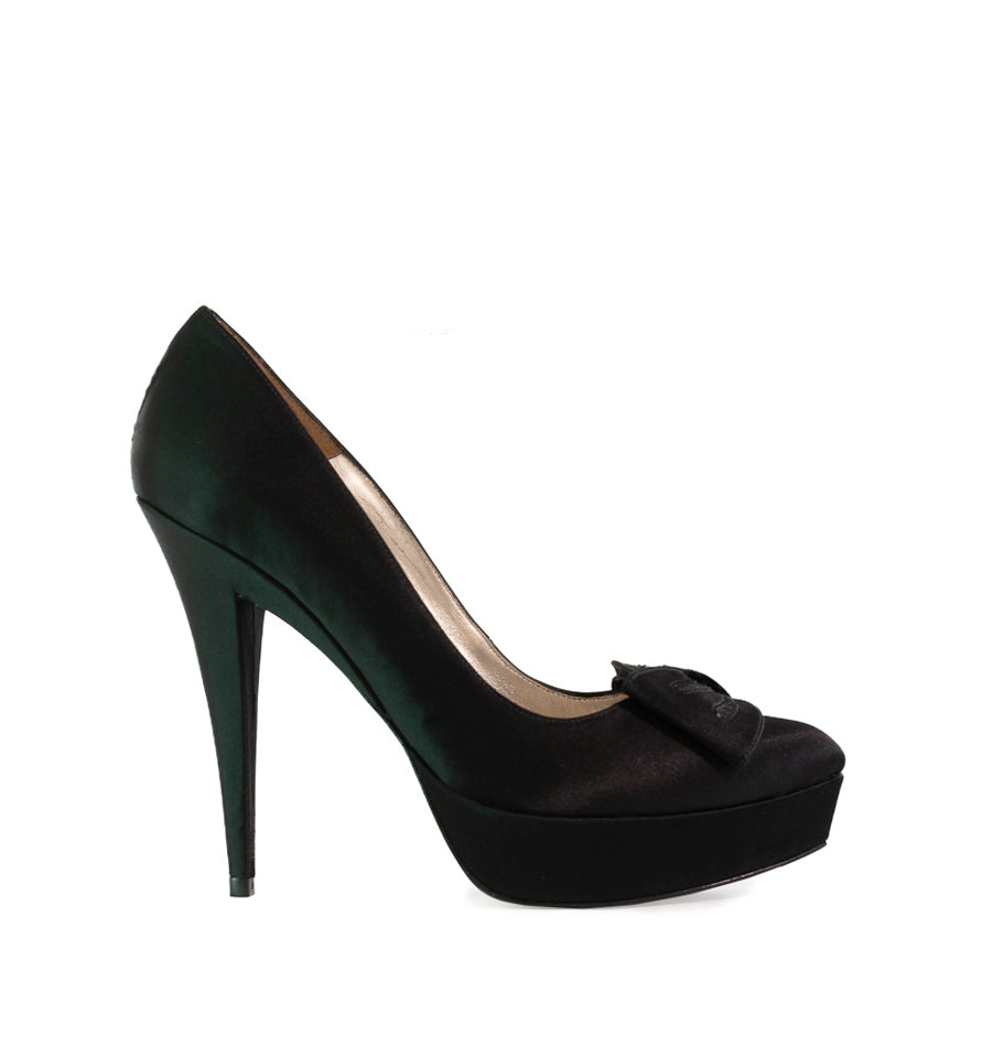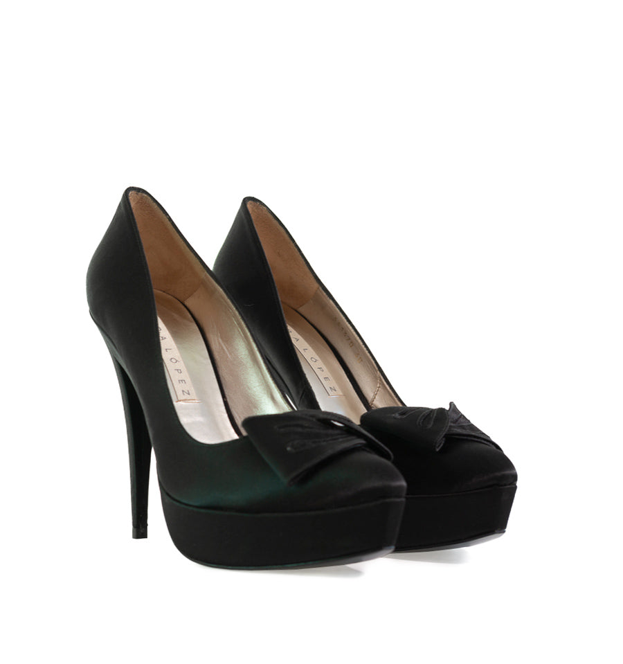 Zapato salón de Pura Lopez fabricado en raso color negro con lazo central y plataforma.