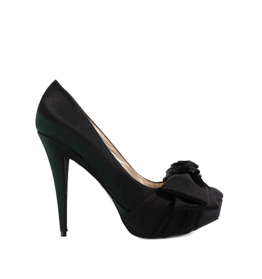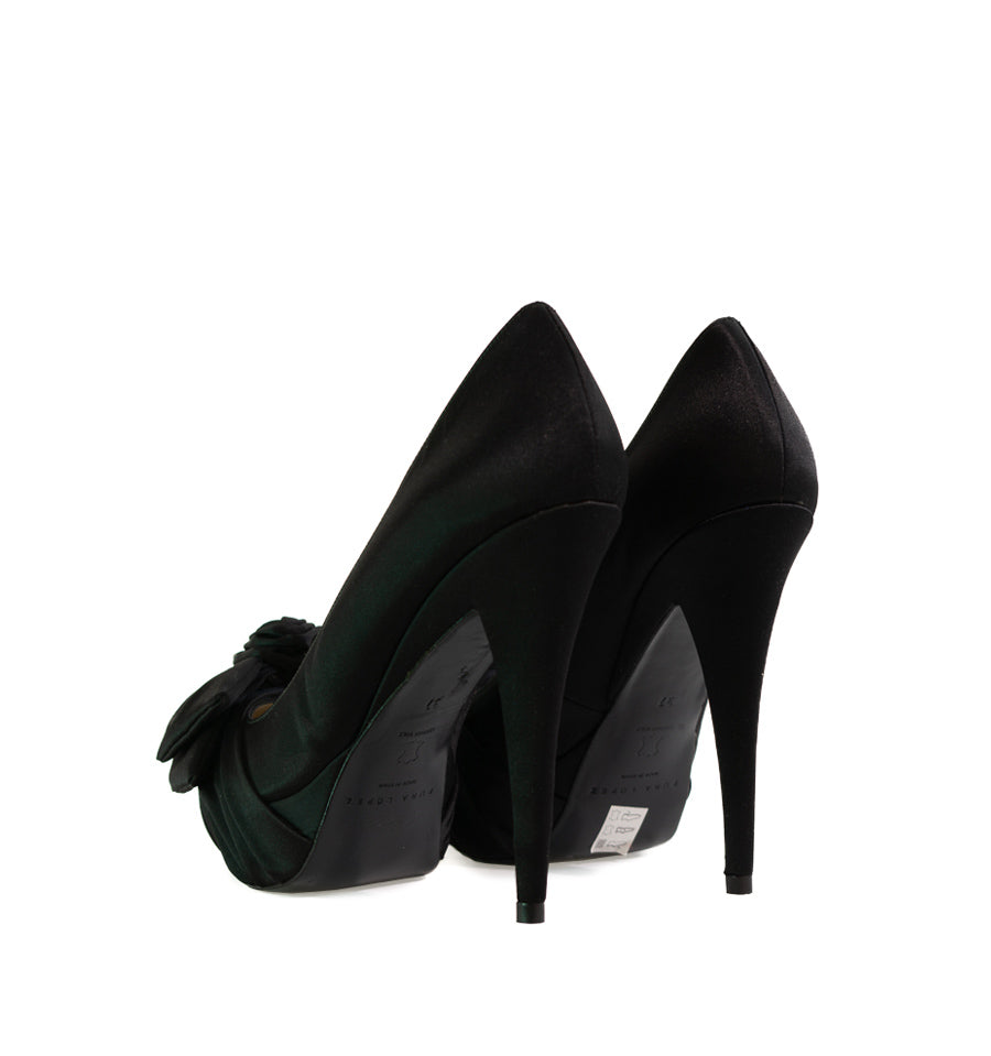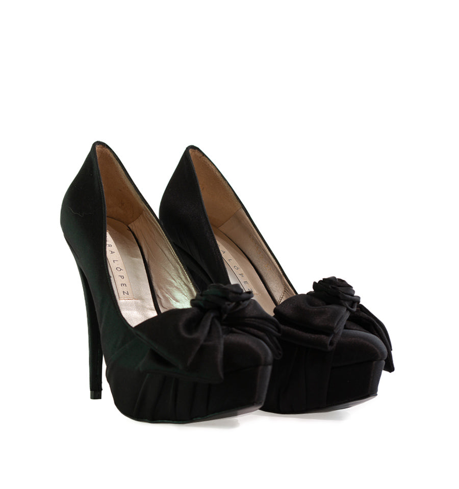 Zapato de salón de Pura Lopez fabricado en raso color negro con lazo+ flor central y plataforma