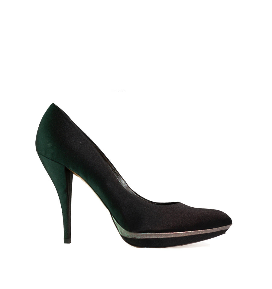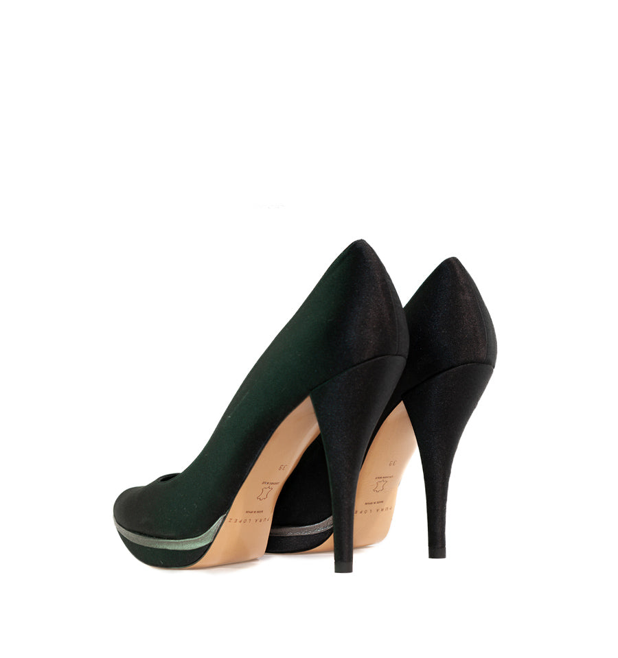 Zapato salón de Pura Lopez fabricado en raso color negro con vivo en piel acero en la plataforma.