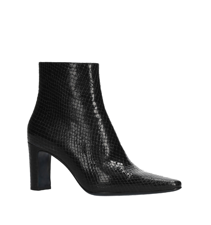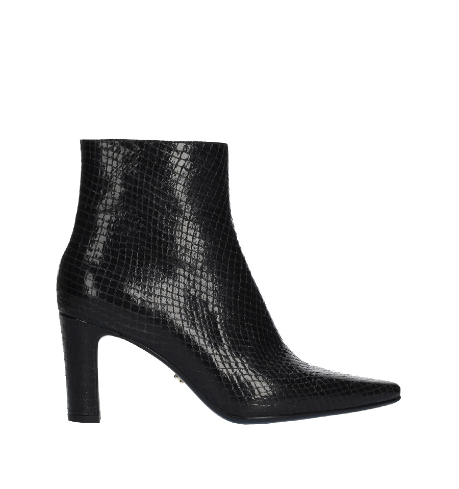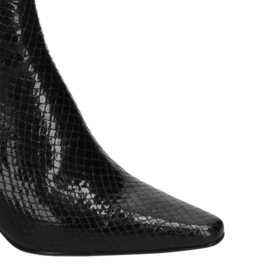 Botín de Lola Cruz en piel grabada pitón color negro con puntera almendrada y tacón medio/alto.