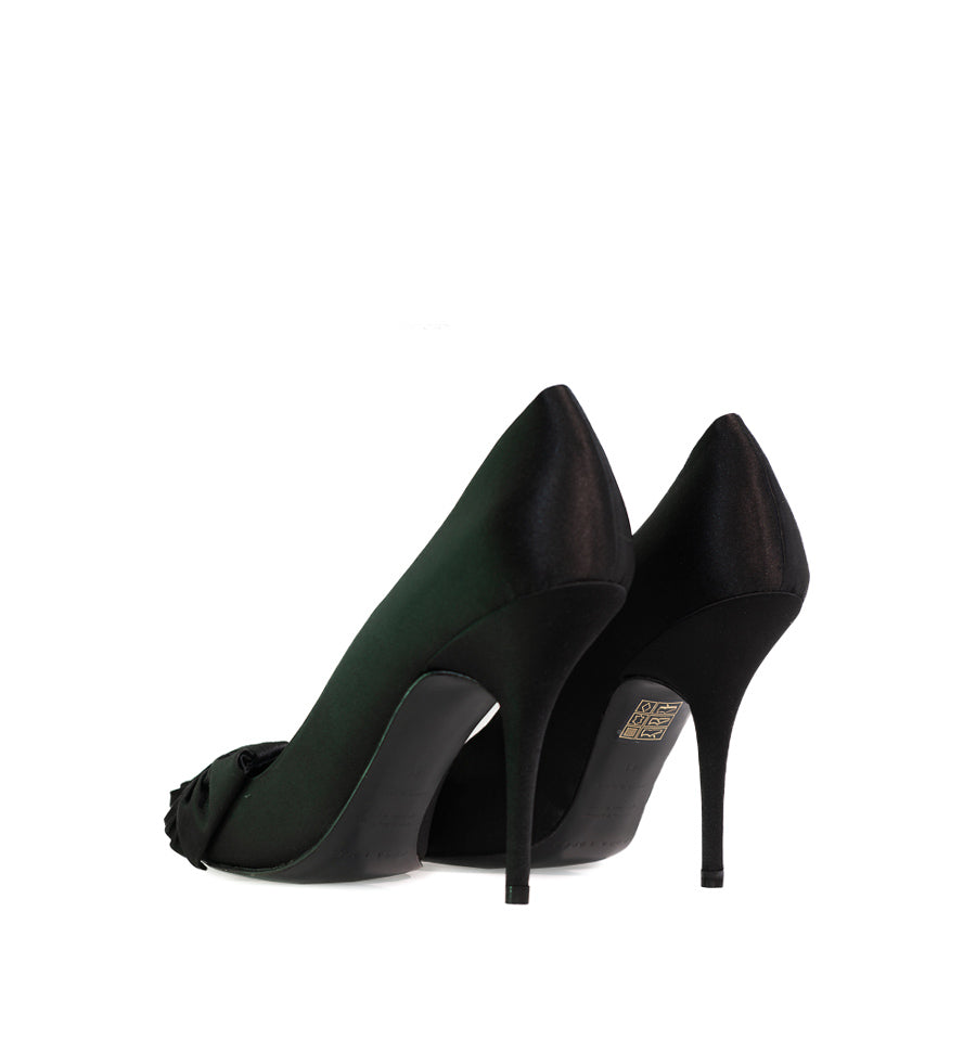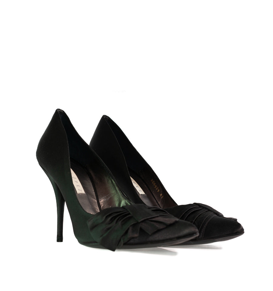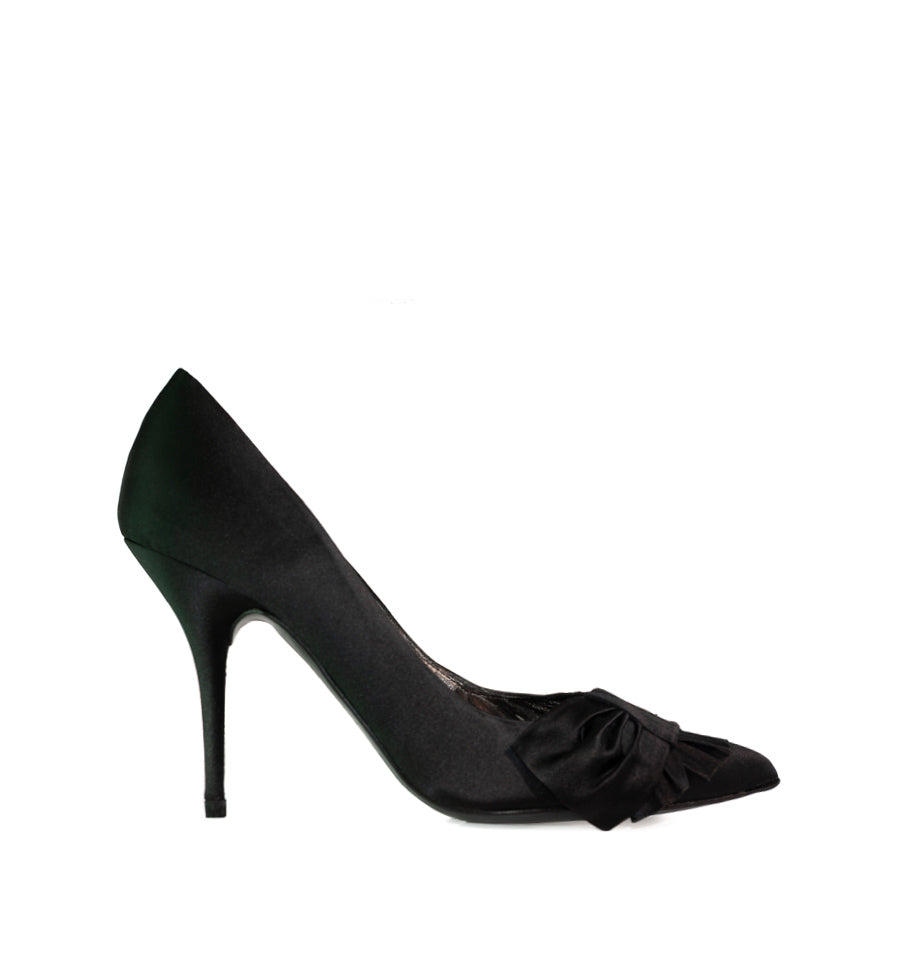 Zapato salón de Pura Lopez fabricado en raso color negro con lazo fruncido lateral.