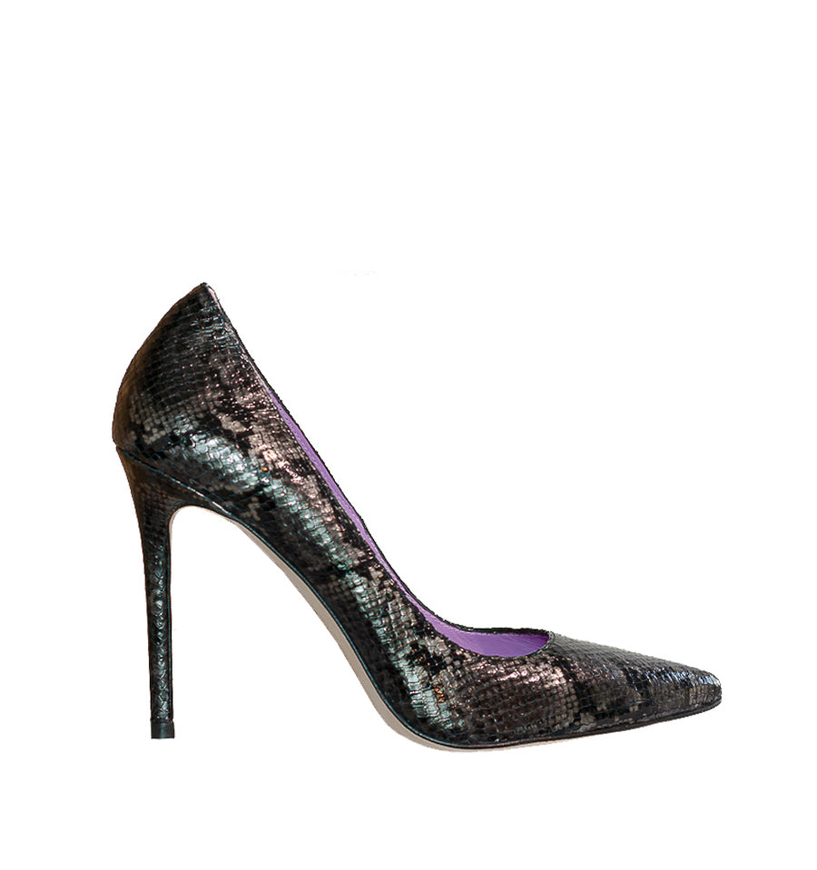 Salón stiletto de Sofia Peralta en piel grabada de color gris plomo con forros en piel morada.