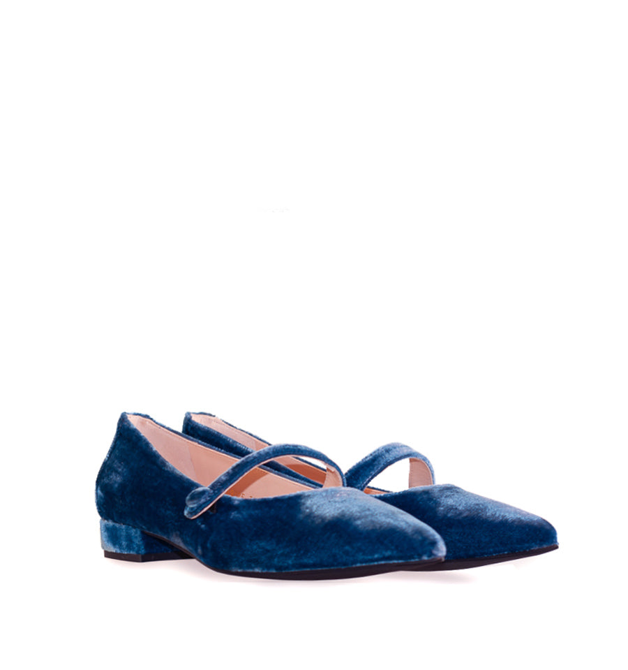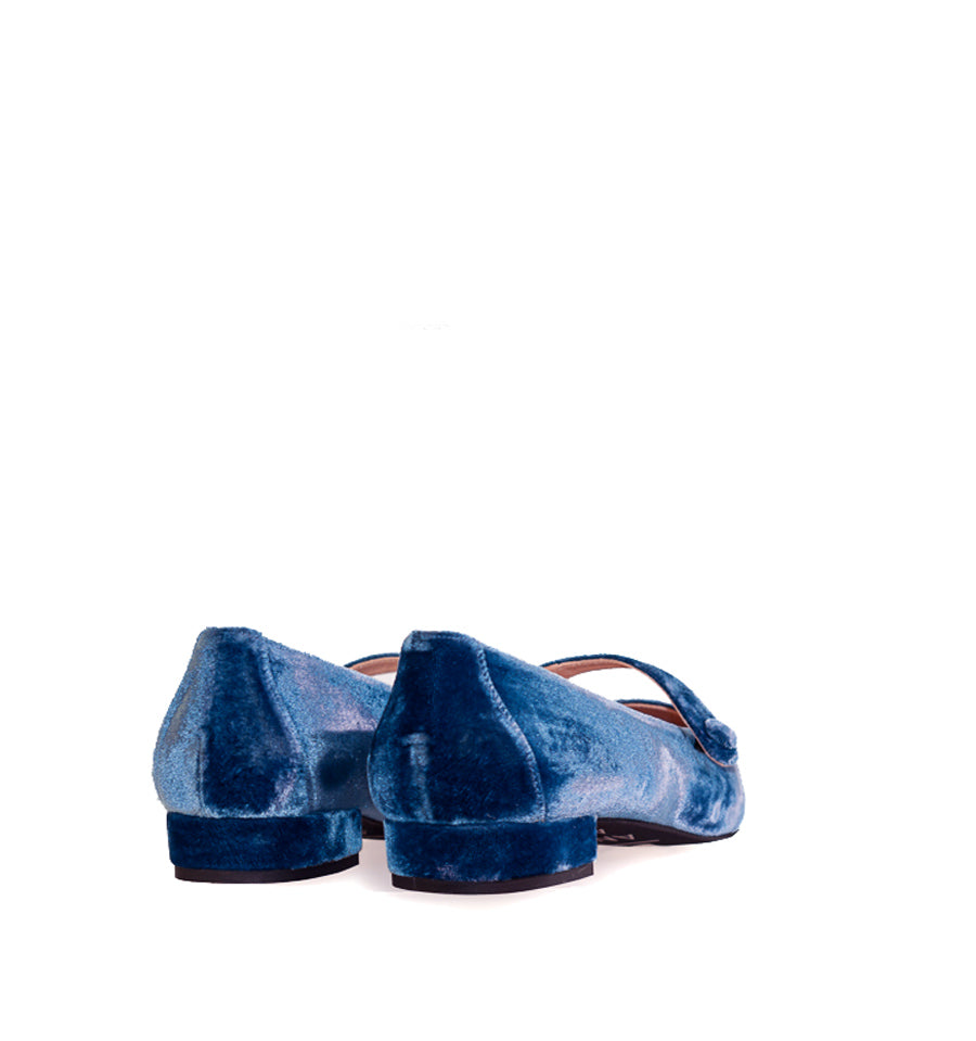 Veneciana de Angari en terciopelo color azul con pulsera baja y botón forrado.